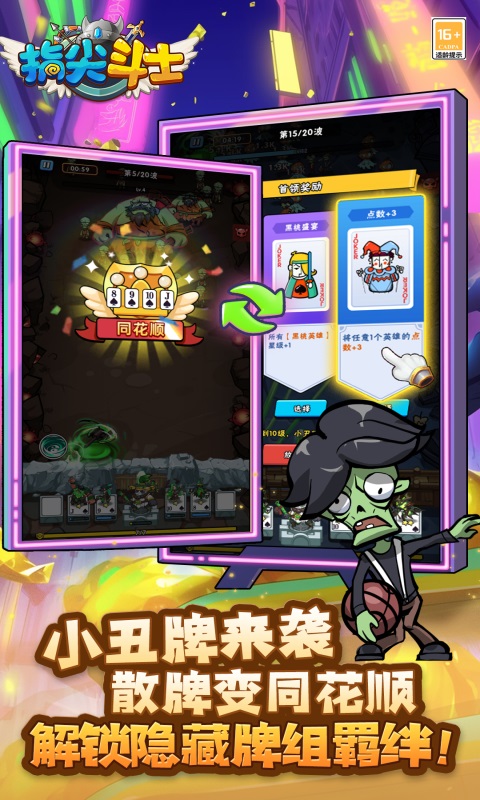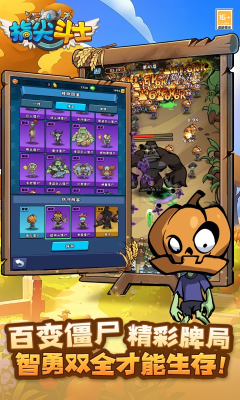 全新公会玩法升级!指尖公会,集结再启! 国内福利首发!通关第一关即可免费领取首充福利,随机获取一位金色品质SSR英雄! 《指尖斗士》是一款创意融合纸牌玩法的益智塔防Roguelike游戏,玩家将扮演一名农场主,利用纸牌的组合策略,抵御愈加猛烈的僵尸入侵,保卫你的庄园和农场。超低上手门槛,只要了解纸牌玩法,就能体验从初学者到爆发式暴击的爽快割草战斗! 【游戏特色】 1、多样牌型技能组合:对子、三条、四条、同花、同花顺等丰富牌型,搭配多种技能与羁绊,策略性十足,每一步组合都至关重要; 2、超多福利上线送:免费体力、挂机奖励等超多福利,轻松享受游戏的乐趣,无需消费即可体验爽快感; 3、开局好牌,畅爽体验:幸运开局,起手好牌让你快速展开战斗,每一局都带来全新的游戏体验; 4、多样化僵尸敌人:从疯牛僵尸到巨人僵尸,各种类型的怪物造型独特,带来真实刺激的尸潮入侵体验; 5、丰富挑战模式:随着难度逐步提升,面对越来越强的尸潮,你能否利用策略和技能,成功抵御下一波侵袭? 快来体验《指尖斗士》,挑战你的牌技与塔防策略,守护你的农场庄园吧!