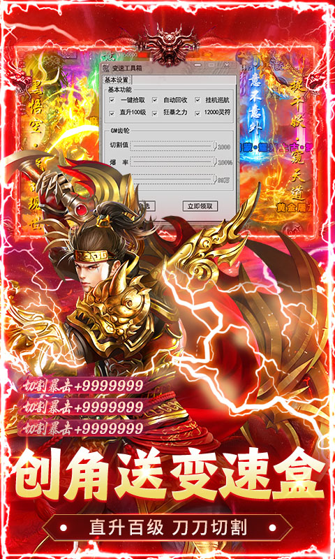1、创角即送变速工具箱,使用后获取自动回收/拾取、狂暴之力、直升百级、挂机巡航,和大量切割值,100%爆率和海量元宝灵符。